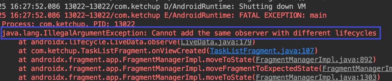 기존 프래그먼트가 종료되지 않았기 때문에 옵저버 리소스가 회수되지 않은 상태이고, 같은 TaskListFragment에서 다시 옵저버를 등록하려고하면서 Exception이 발생했다.
