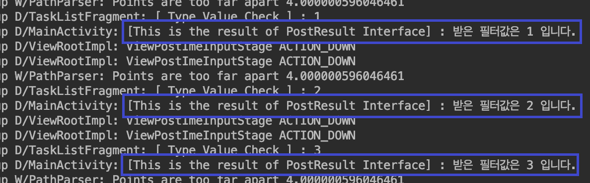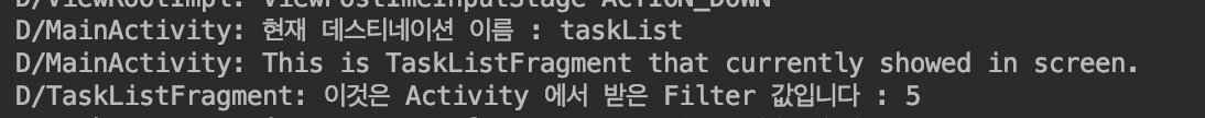 생성된 TaskListFragment에서 Fragment가 종료되지 않고도 Activity로 여러 번 데이터를 보내는 것을 확인할 수 있다.