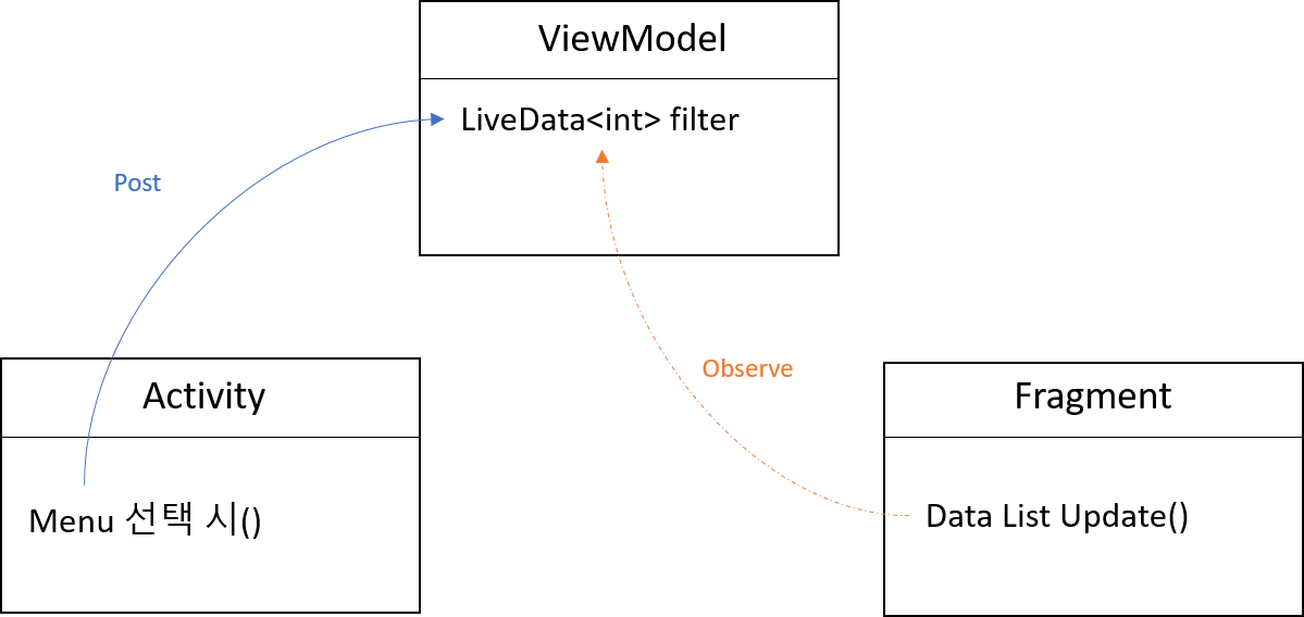 ViewModel에 Filter라는 라이브데이터를 추가하고 Activity에서 메뉴를 선택 시에 LiveData에 값을 포스트하고