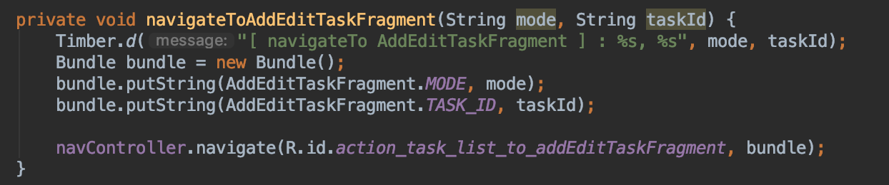 그리고 navController의 navigate(resId, bundle) 메소드를 통해 화면전환을 실행한다.