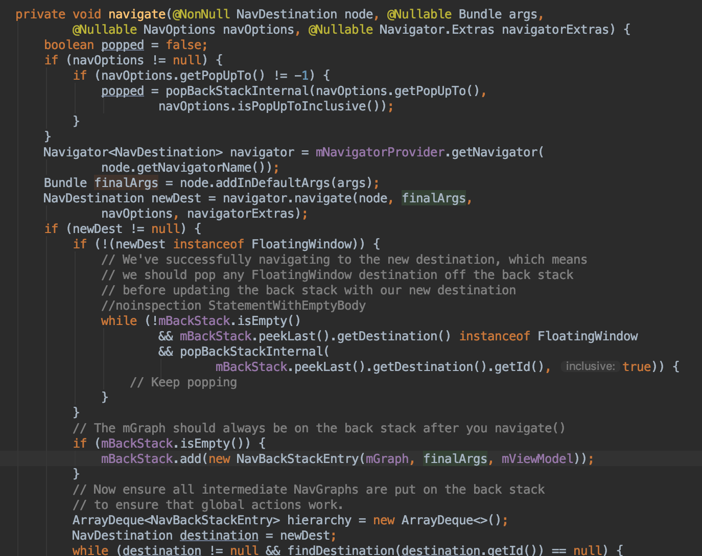 navOptions으로 popUpTo 그리고 PopUpToInclusive가 선택됐는지를 가장 상단에서 확인하고 있다.