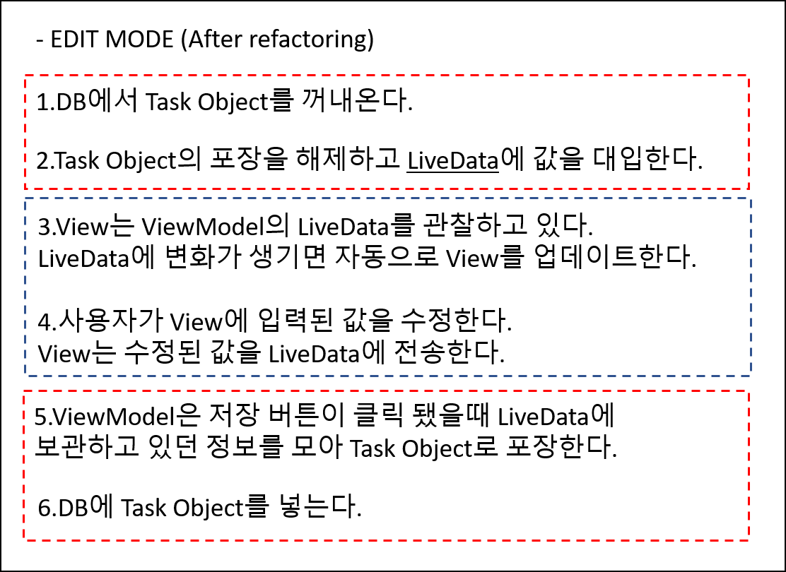 그리고 저장 버튼이 클릭 됐을 때 ViewModel은 View의 도움 없이 보관하고 있던 LiveData의 값을 참조하여 Task Object를 생성할 수 있다.