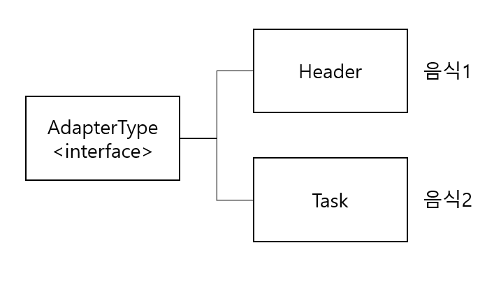 하나의 리스트로 여러가지 음식들(자료형)을 관리하기 위해서 AdapterType이라는 새로운 인터페이스를 만들어서 해결하도록 하자.