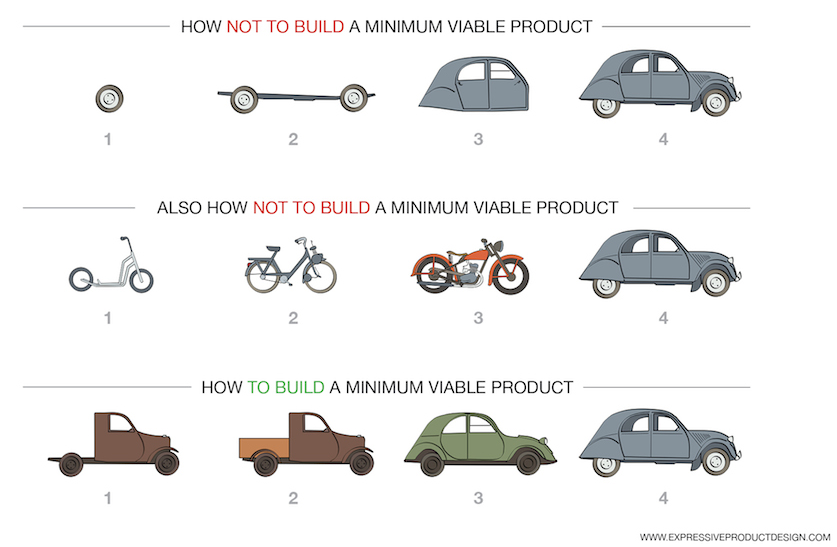 간단히 말하자면 고객으로부터 양질의 피드백을 얻고 시행착오를 줄이며 개선된 버전의 제품을 만드는 과정을 반복하는 것이다. 이때 가장 중요한 점은 사용자가 직접 사용해보고 피드백을 줄 수 있는 적절한 수준의 최소 기능을 정의해야한다는 점이다. 자동차를 만들고 싶다면 자동차의 기본인 주행이 가능한 프로토타입을 만드는 것이 우선이 되어야하고, 피드백을 통해 주행 성능을 개선할지 혹은 승차감을 개선할지 프로젝트의 방향성을 잡을 수 있을 것이다.