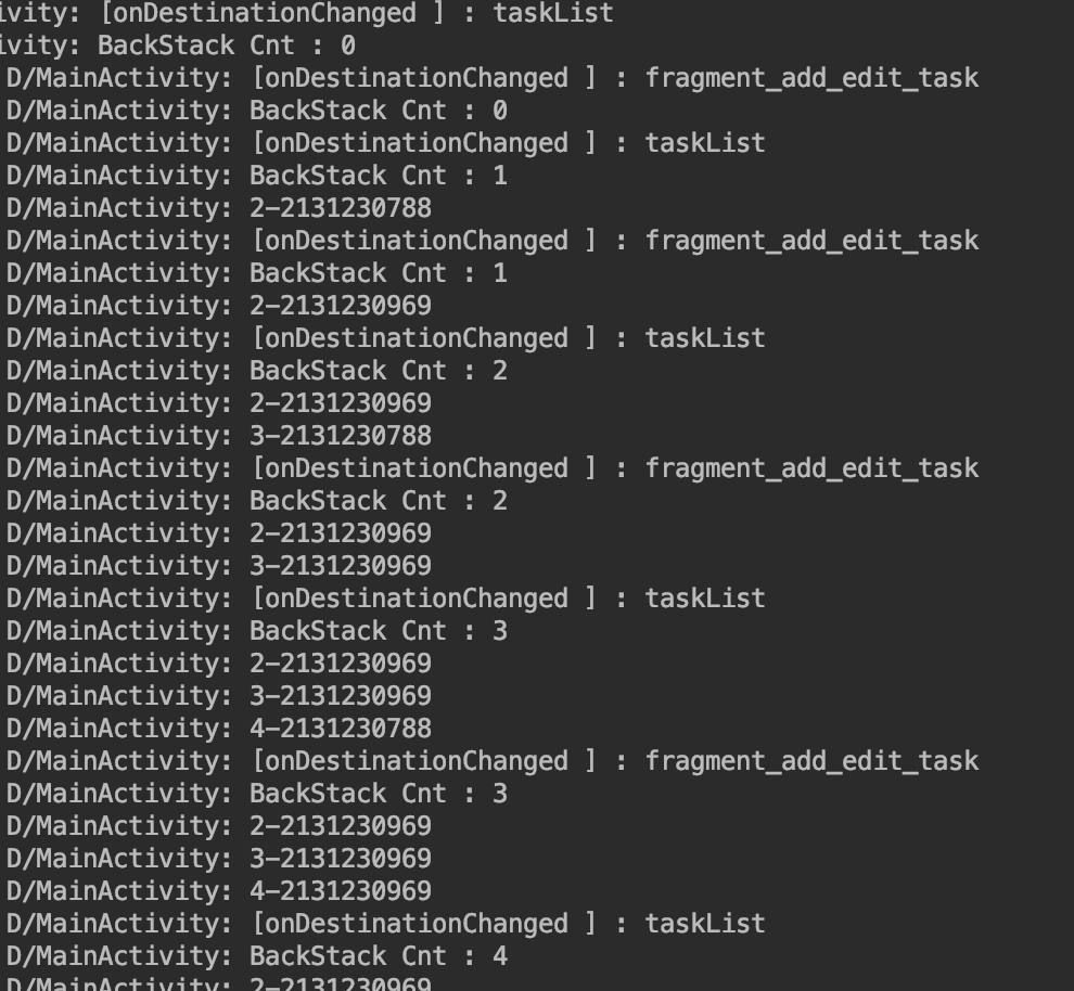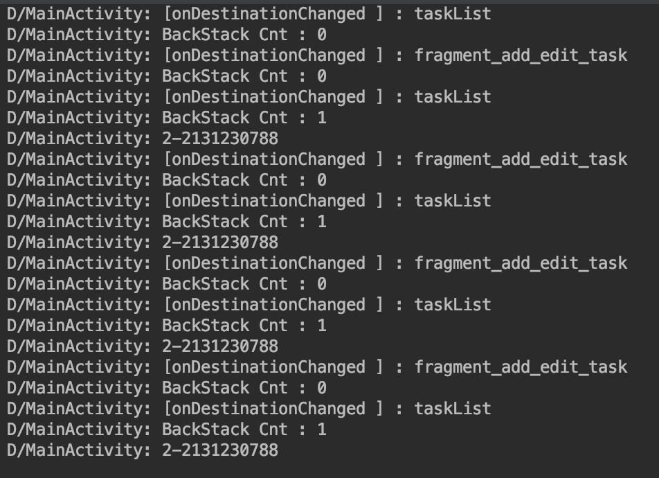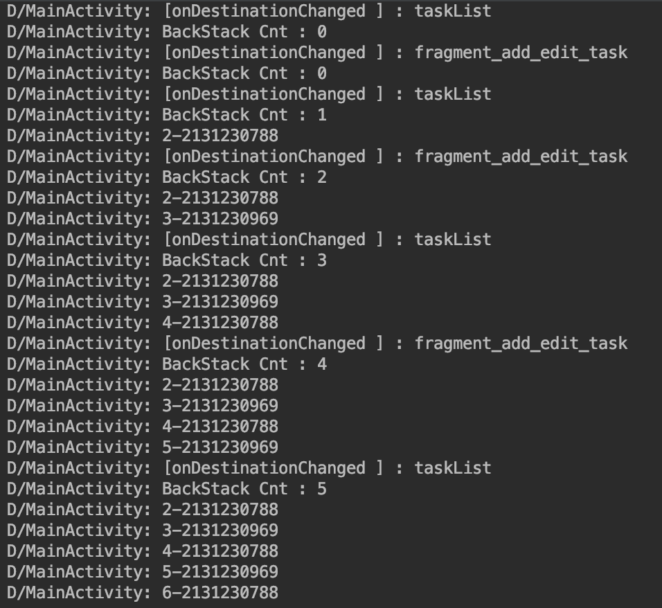 popUpTo를 사용하지않고 navigateToTaskListFragment() 했을때의 백스택을 출력해본 것이다.