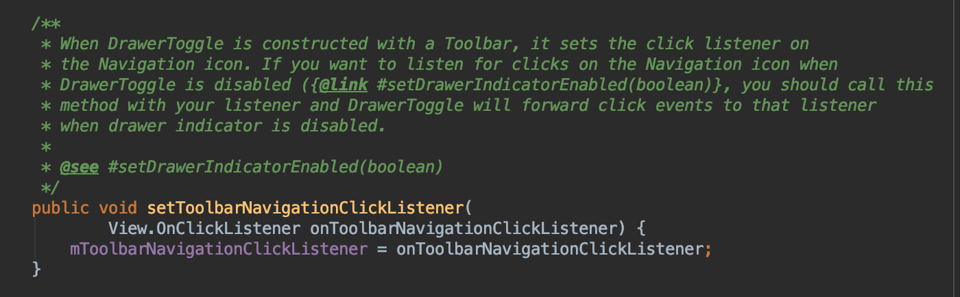 ActionBarDrawerToggle을 살펴보면 Drawer를 disable 시키고 Toolbar의 Action를 위한 Listener를 세팅하는 메소드가 구현되어 있다. 그리고 주석으로 잘 설명되어있다.