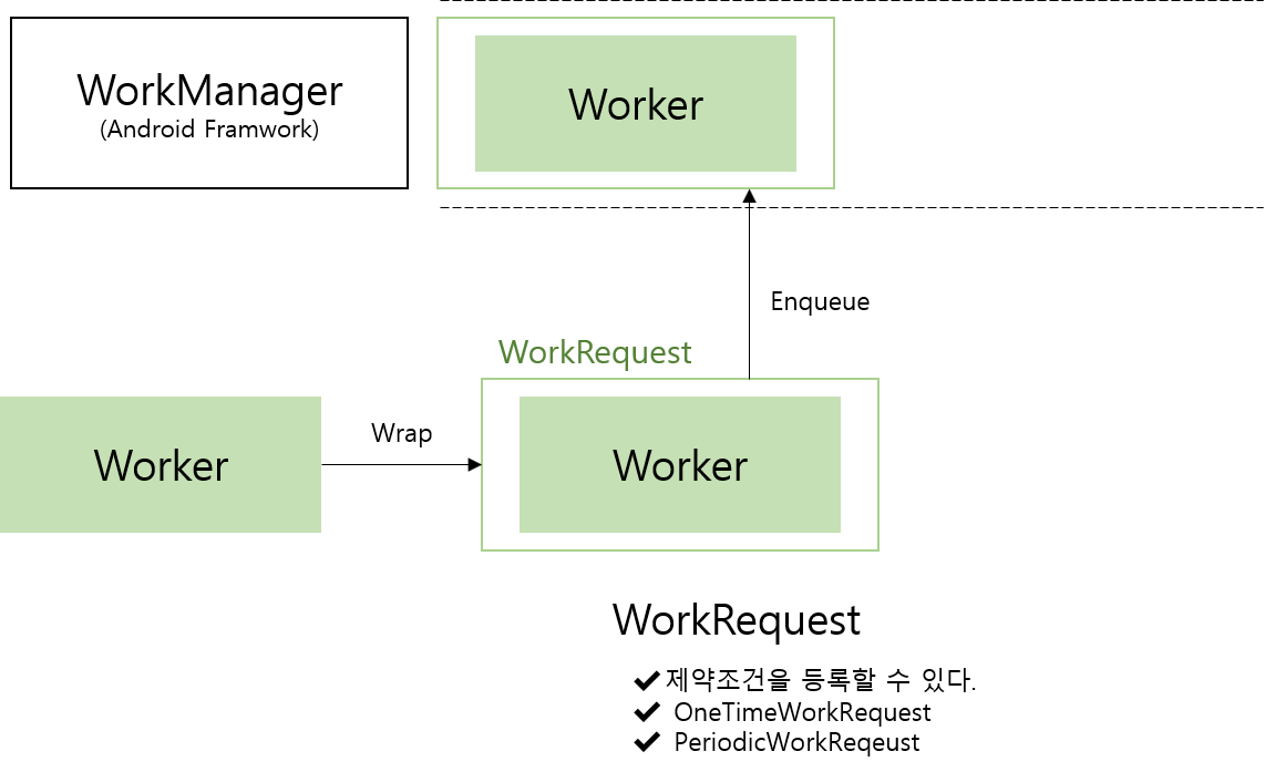 WorkRequest는 PendingIntent와 유사한 역할이다. 실행할 백그라운드 작업을 가지고 있는 Worker를 WorkRequst에 첨부한다.