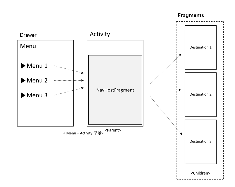 위 그림의 NavHostFragment 영역에 자식 프래그먼트들이 전환되어 사용되어집니다.