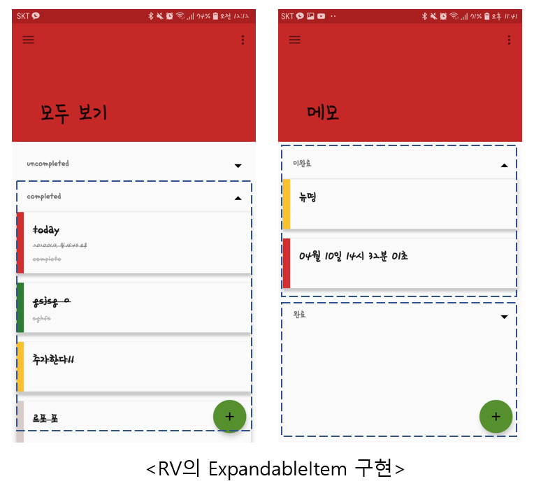 많은 수의 할 일이 저장되었을 때 쉽게 스크롤하여 찾을 수 있도록 리사이클러뷰의 아이템을 접을 수 있도록 구현하였습니다.