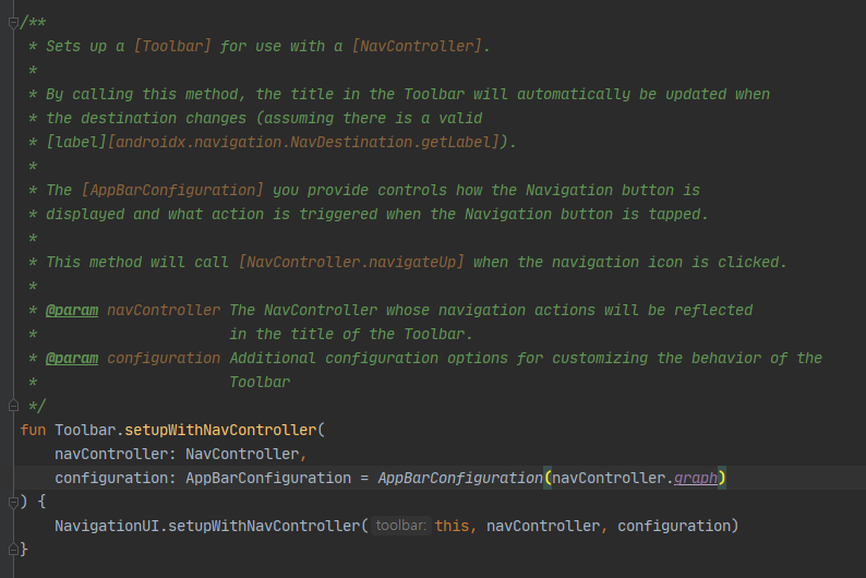 toolbar.apply { setupWithNavController(navController, appBarConfigWithDrawer) }