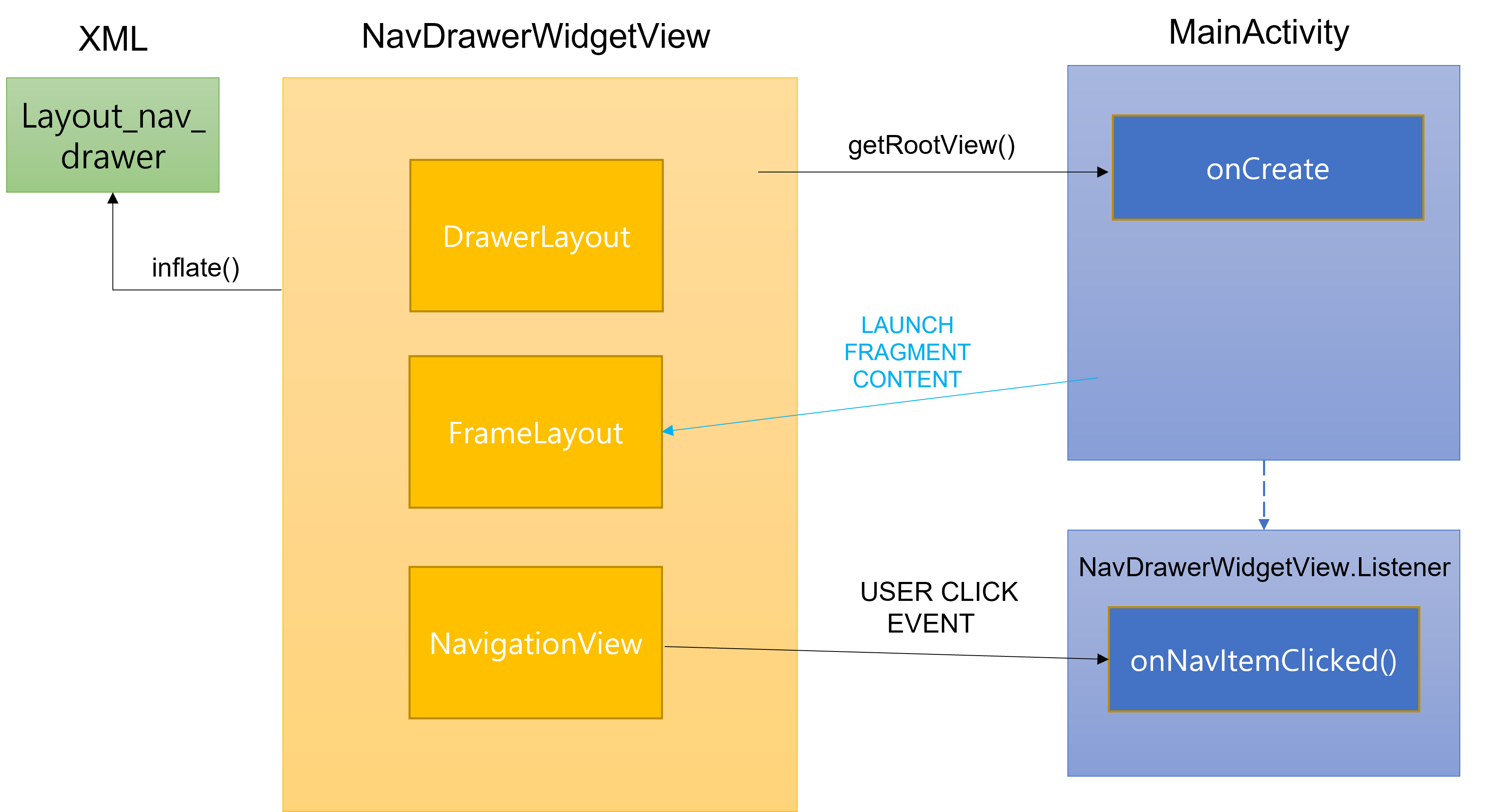 하지만NavDrawerWidgetView가 XML과 연결되어 있는 UI Component이므로, Activity에서 setContentView(NavDrawerWidgetView)를 하여 WidgetView와 Activity를 연결한다.