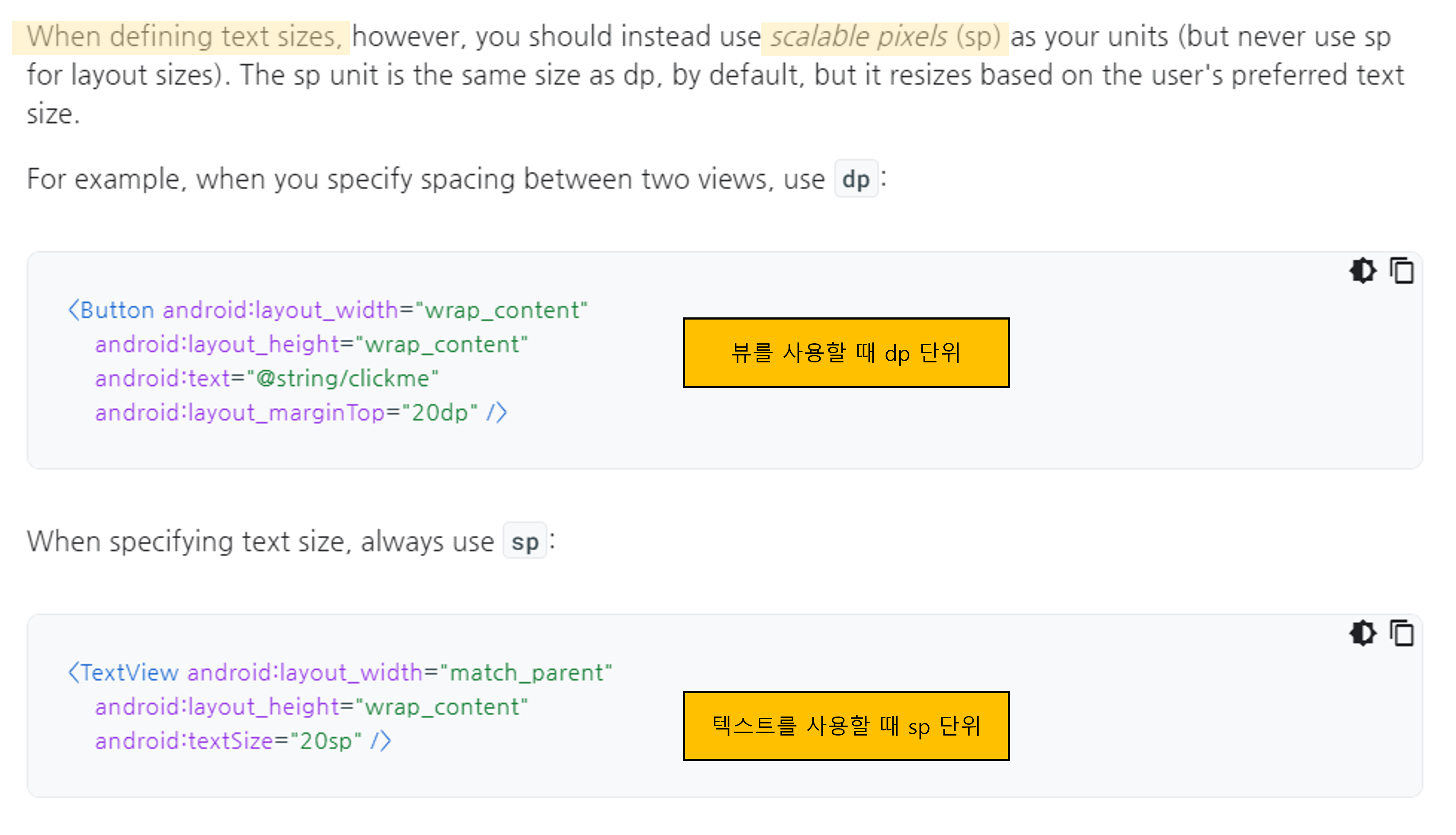 - 글자를 표현할 때는 sp단위를 써야한다.